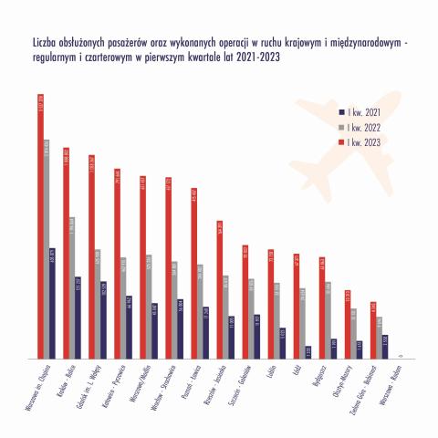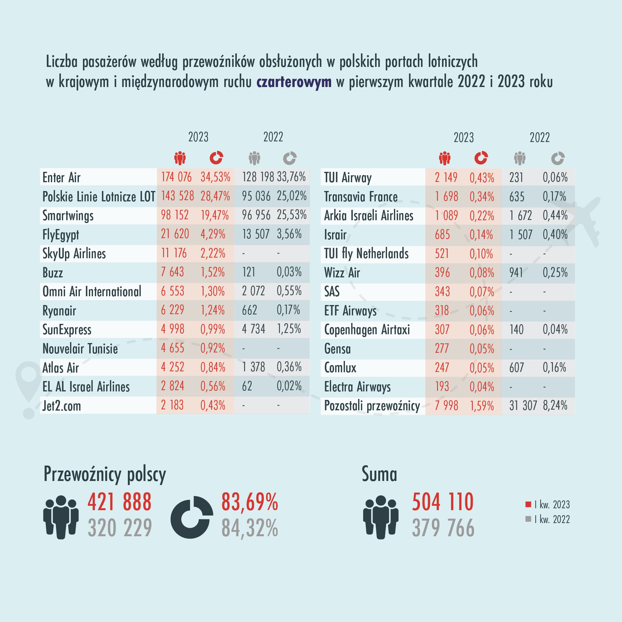 Najwięcej pasażerów w ruchu czarterowym obsłużyły Lotnisko Chopina w Warszawie (178,6 tys., +39,1 tys. do roku 2022), Port Lotniczy Katowice w Pyrzowicach (176,2 tys., +31,1 tys. do roku 2022), Port Lotniczy Poznań-Ławica (58,2 tys., +16,8 tys. do roku 2022). Największe wzrosty względem pierwszego kwartału 2019 roku uzyskały Port Lotniczy Katowice w Pyrzowicach (+36 tys. pasażerów), Lotnisko Chopina w Warszawie (+24,5 tys.) i Port Lotniczy Poznań-Ławica (+20,1 tys.)