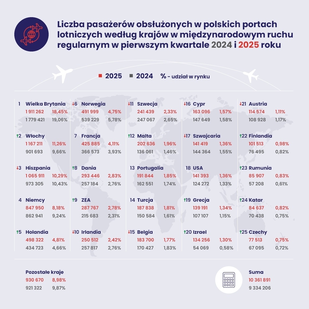 W ruchu regularnym międzynarodowym i krajowym w pierwszym kwartale 2025 roku polskie porty lotnicze obsłużyły 11,1 mln pasażerów (+10,2 proc. względem tego samego okresu 2024 r.). Najwięcej pasażerów i największe wzrosty odnotowano na trasach do/z Wielkiej Brytanii (1,9 mln pasażerów, +131,8 tys.), Włoch (1,2 mln, +265,5 tys.) i Hiszpanii (1,1 mln, +92,6 tys.). Natomiast największe spadki wystąpiły na trasach do/z Norwegii (-47, 2 tys.), Albanii (-21 tys.) i Niemiec (-15 tys.).