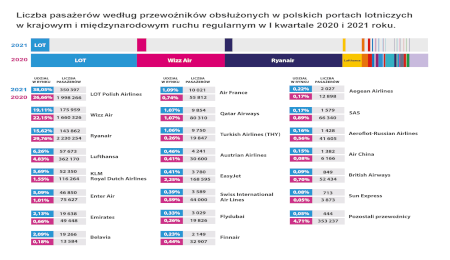 W I kwartale 2021 r. obsłużono ponad 1 mln pasażerów (tj. 87 proc. mniej niż w 2020 r. i 89 proc. mniej niż w 2019 r.) i zrealizowano 15,7 tys. operacji lotniczych (tj. o 79 proc. mniej niż w 2020 r. i 81 proc. mniej niż w 2019 r.).