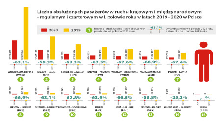 8 mln pasażerów i prawie 78 tys. operacji lotniczych w pierwszej połowie 2020 r.Ponad 8 mln pasażerów oraz 77,7 tys. operacji lotniczych obsłużyły polskie porty lotnicze w pierwszej połowie 2020 r. Ruch pasażerski, w porównaniu z pierwszą połową 2019 r., zmalał o 64 proc., a liczba operacji o 59 proc.