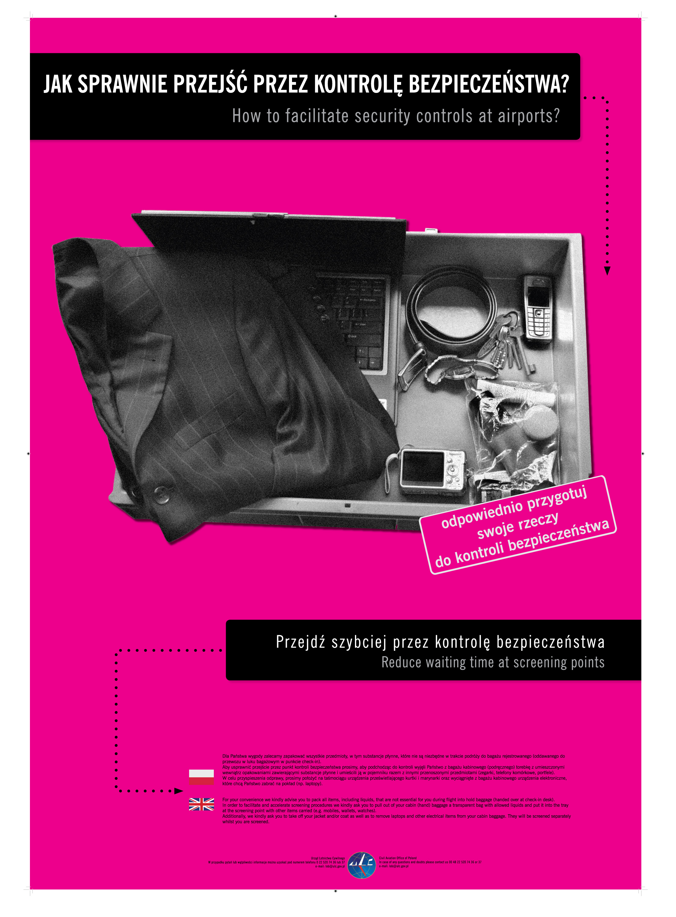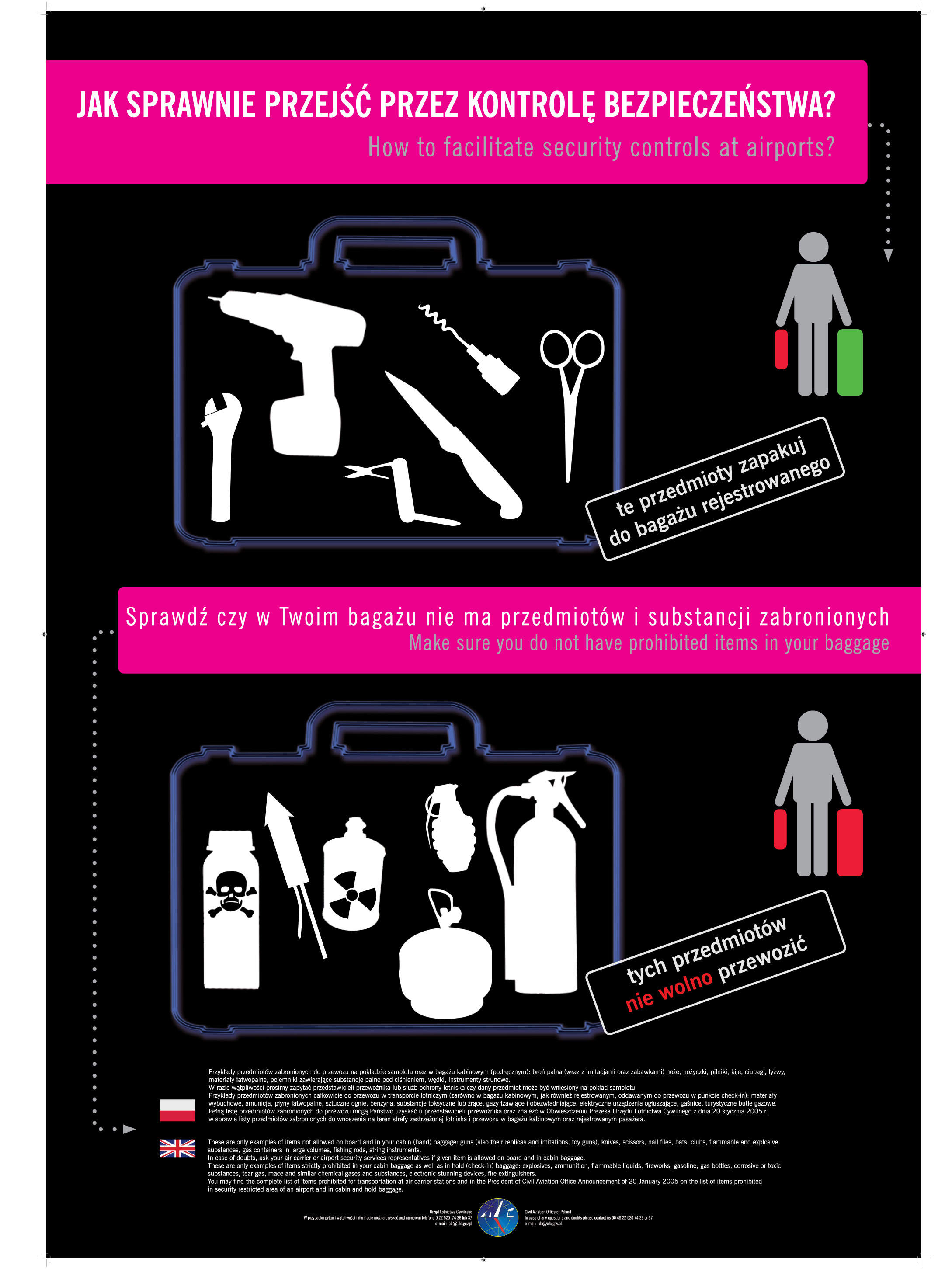 Korzystając z okazji, Departament Ochrony i Ułatwień w Lotnictwie Cywilnym przypomina zarządzającym lotniskami oraz przewoźnikom lotniczym, iż właściwe informowanie pasażerów o procedurach odprawy i kontroli ma zasadnicze znaczenie nie tylko dla zapewnienia wysokiego poziomu bezpieczeństwa w transporcie lotniczym, ale także dla sprawnej odprawy pasażerów oraz załóg, co uznać należy za jeden z głównych elementów systemu ułatwień w lotnictwie cywilnym.