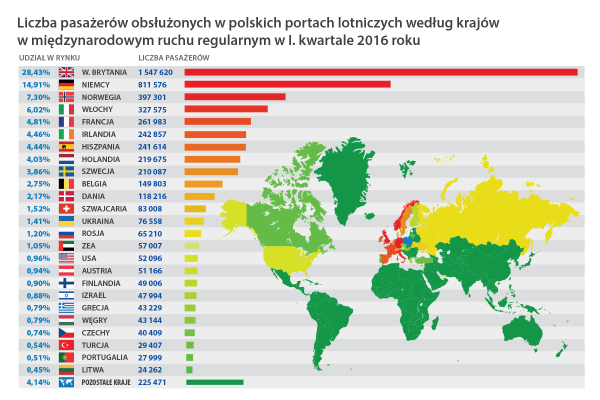 W ramach przewozów regularnych w pierwszym kwartale, największe wzrosty były w przypadku Wielkiej Brytanii, a następnie Niemiec, Hiszpanii i Norwegii. W przewozach czarterowych najpopularniejszym kierunkiem była z kolei Hiszpania. Warto wskazać, że spadki miały miejsce w przypadku kierunków o niestabilnej sytuacji politycznej jak Egipt, Izrael czy Turcja.