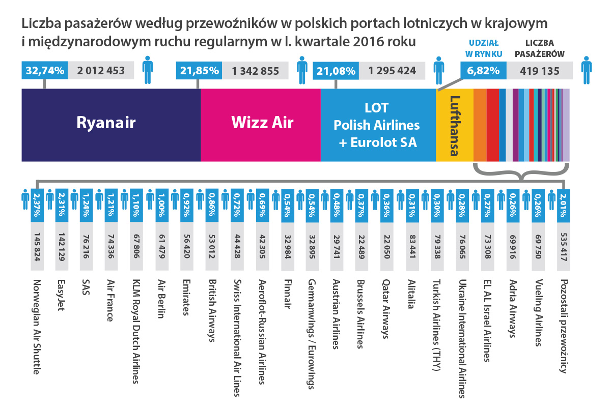 W pierwszym kwartale 2016 doszło do zmiany struktury udziałów w rynku ze względu na model biznesowy przewoźnika lotniczego. Przewoźnicy niskokosztowi zwiększyli swój udział kosztem przewoźników sieciowych i rozwijali się znacznie bardziej dynamicznie. O ile dynamika ruchu LCC w pierwszym kwartale wzrosła o 20%, o tyle w przypadku sieciowych wzrosła o 8%. Najwyższe dynamiki wśród przewoźników LCC uzyskali Ryanair i Wizzair. Dobre wyniki zanotował również Easy Jet. Norwegian z kolei, po zdecydowanej ekspansji w poprzednich kwartałach znacznie zmniejszył oferowanie. W przypadku przewoźników sieciowych największe wzrosty ilościowe miał PLL LOT, a następnie KLM i Lufthansa.